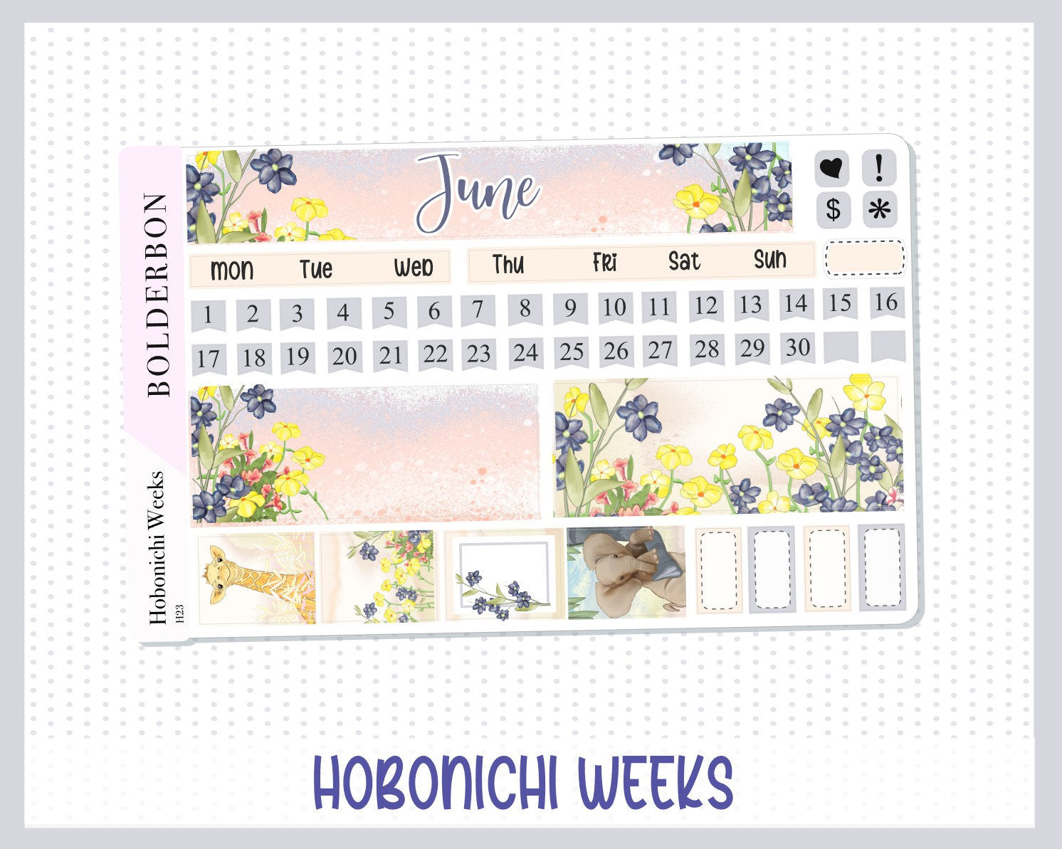 This beautiful Hand Drawn JUNE Monthly Sticker Sheet is made to fit in your Hobonichi Weeks Planner, but can work well in other small planners of similar size.